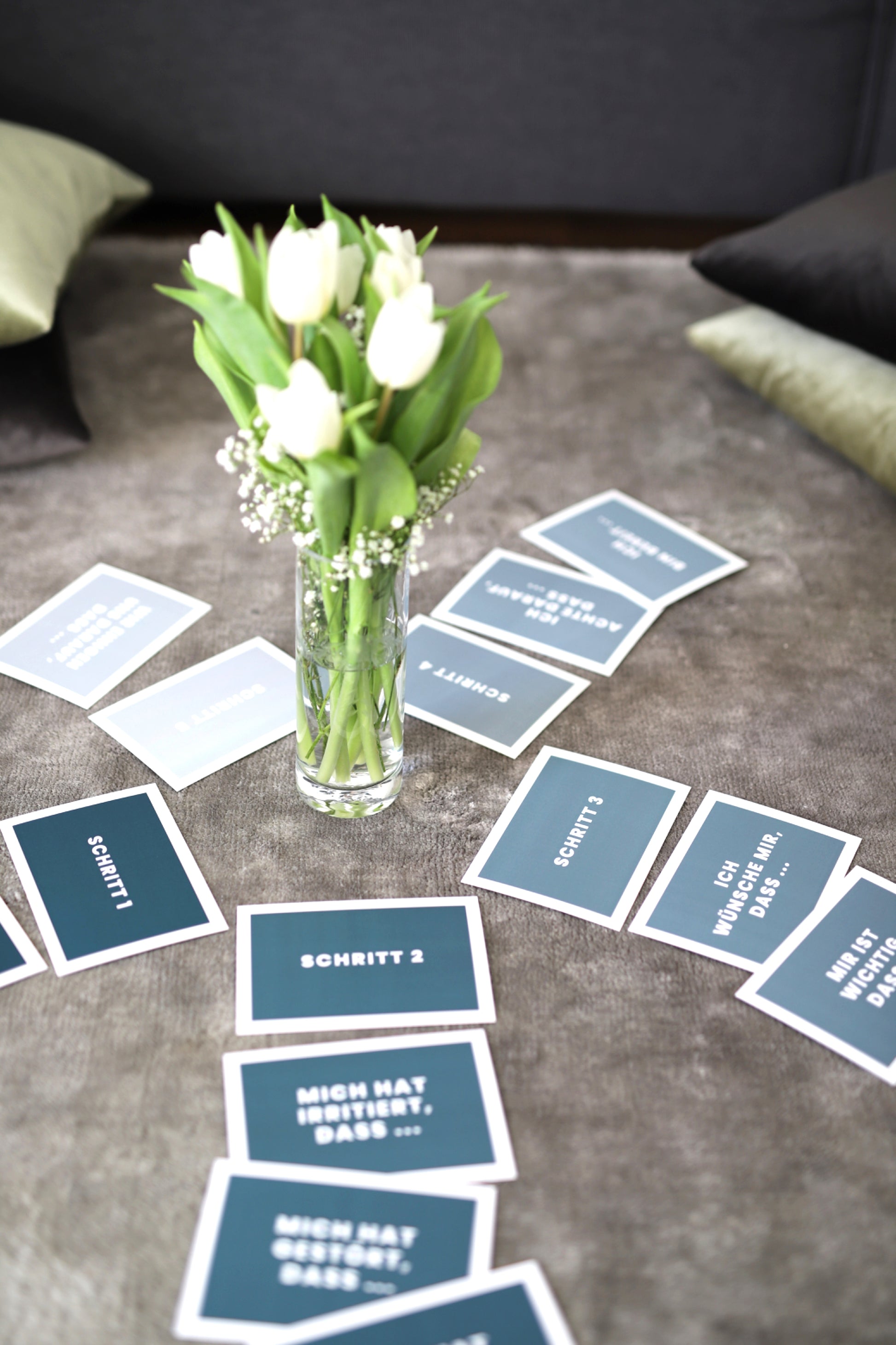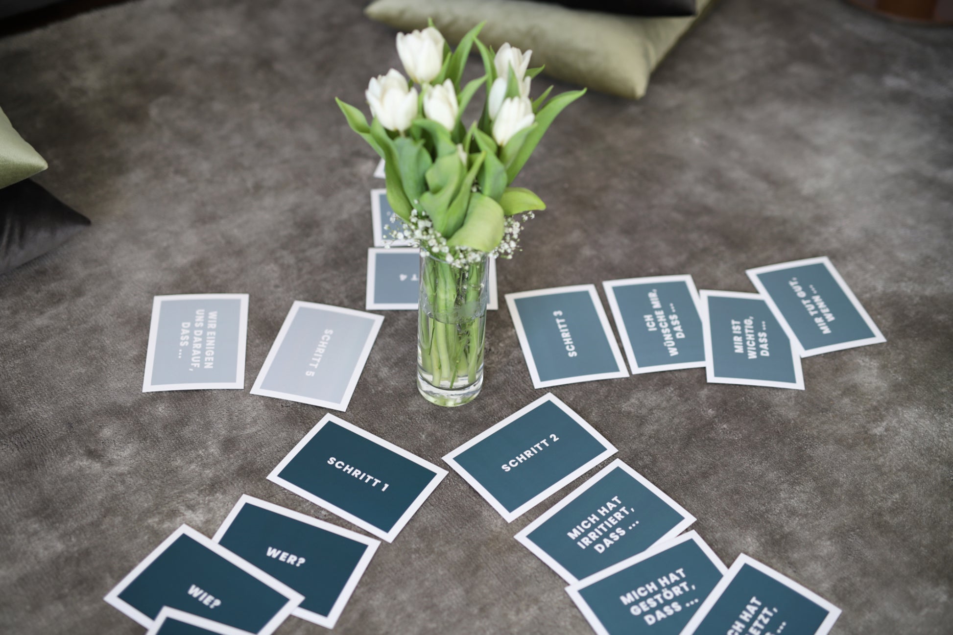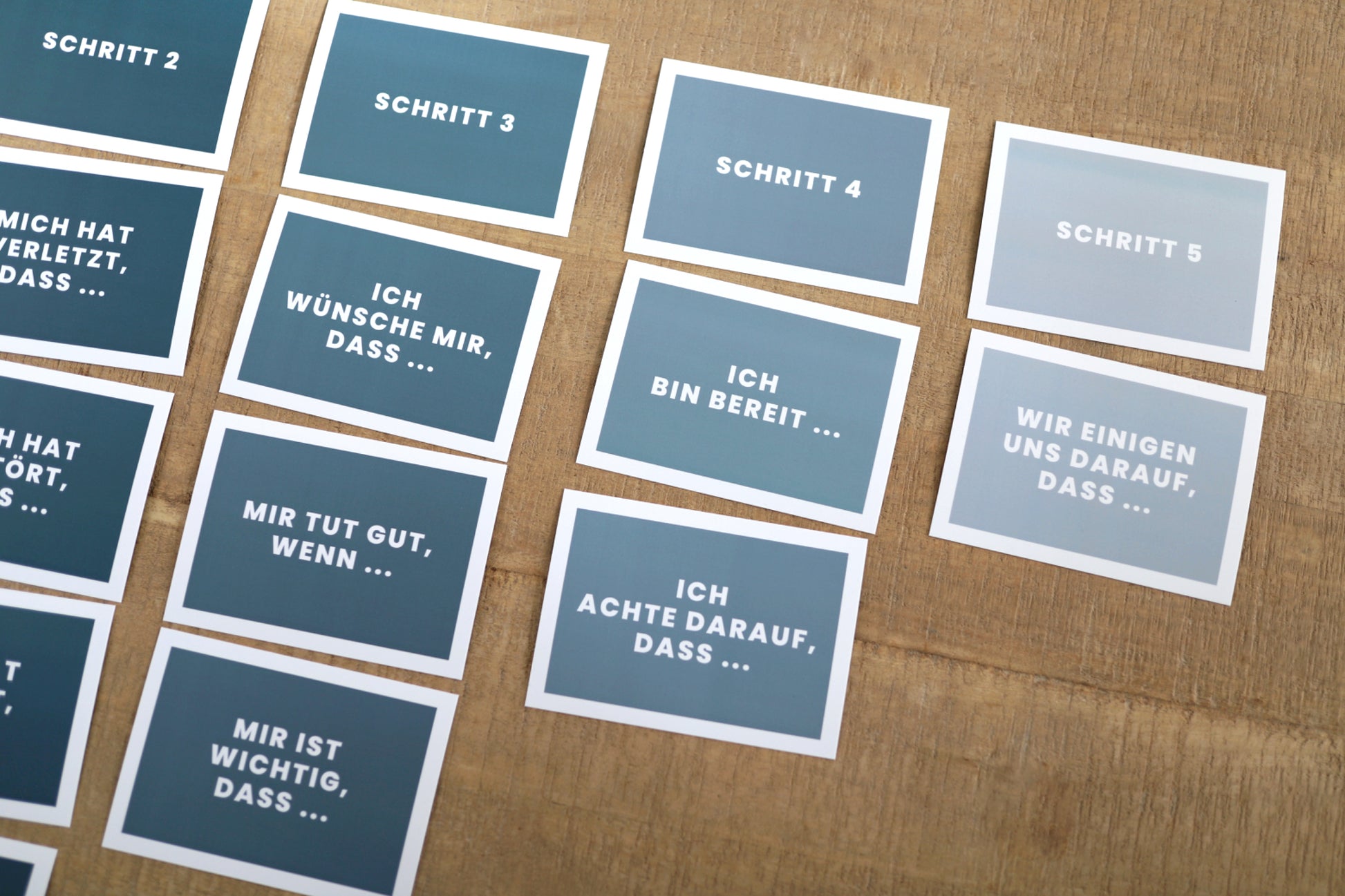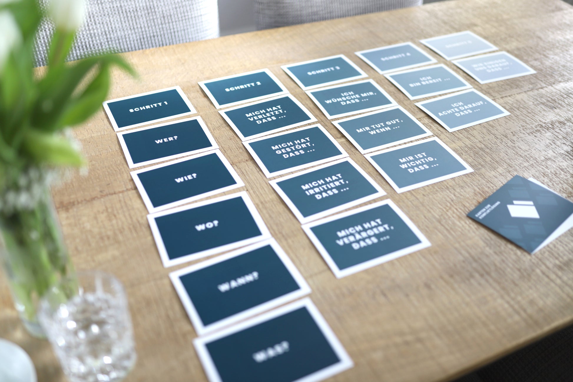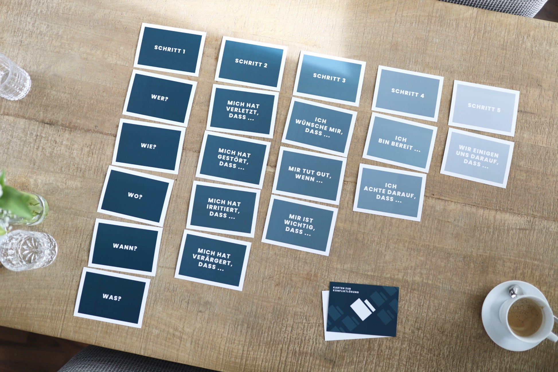 Die 20 Karten laden zum gemeinsamen Austausch ein und flankieren vom Ausgangspunkt des Konflikts bis hin zur gemeinsamen Lösung, sodass es am Ende keinen Verlierer gibt.