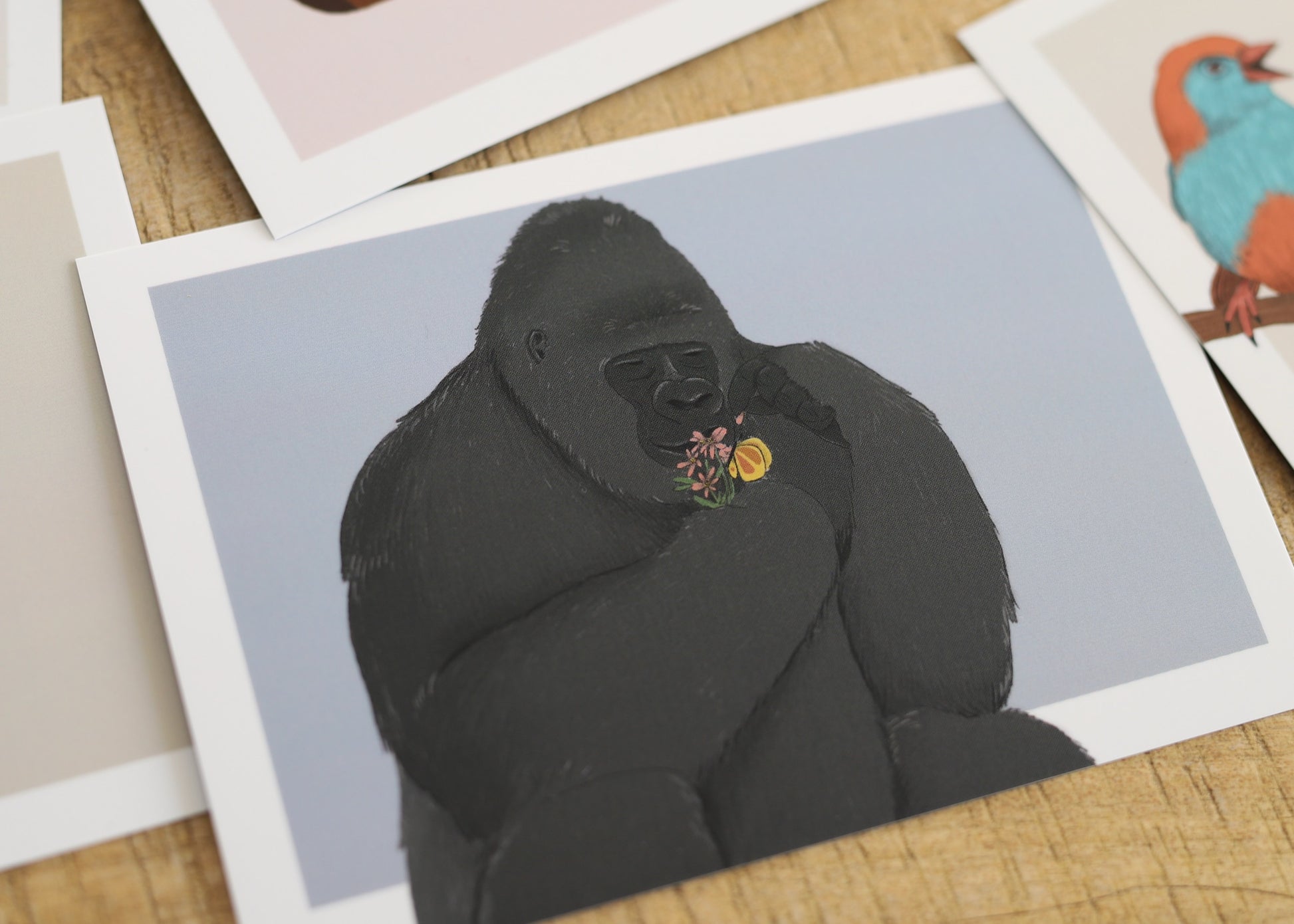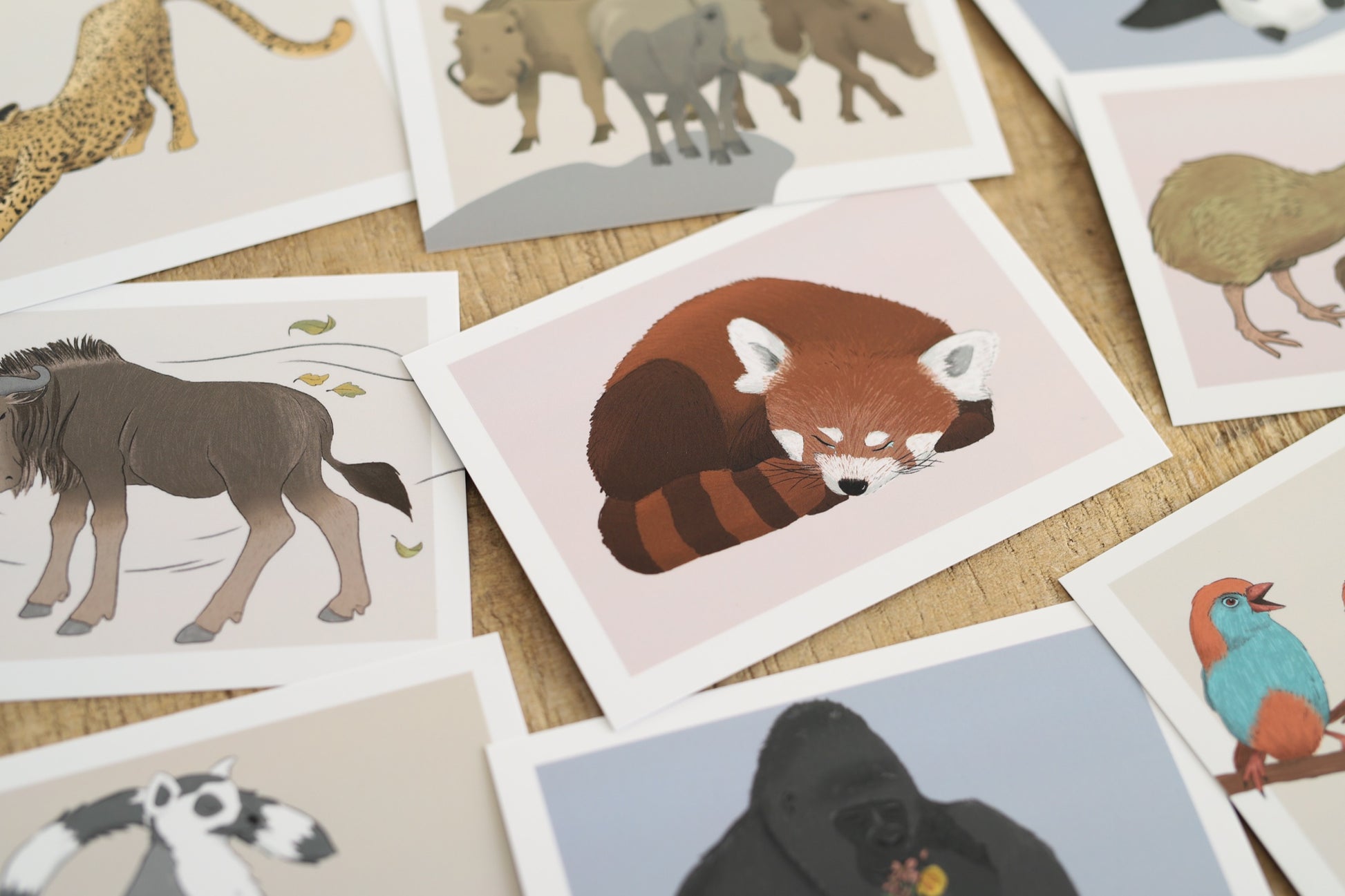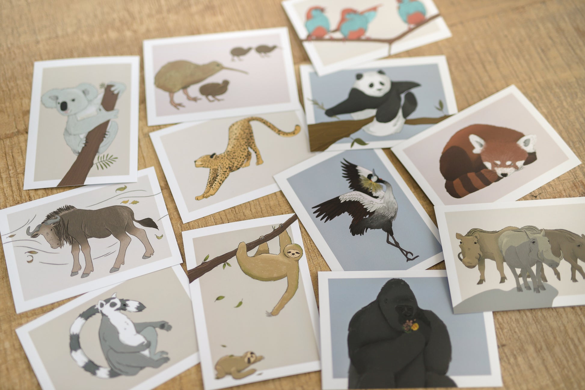 Tierkarten zum Thema Gefühle - Set 2: Blauastrild, Faultier, Gnu, Gorilla, Jaguar, Katzenbär, Kiwi, Koala, Kranich, Lemur, Panda und Warzenschweine.