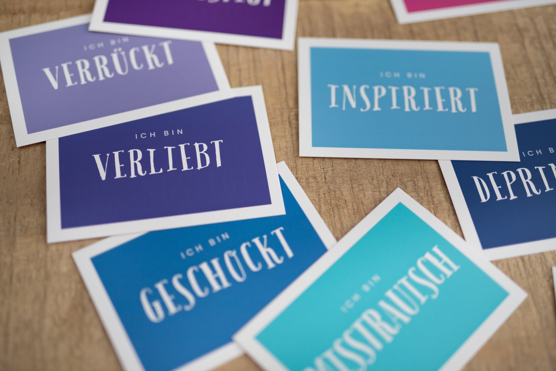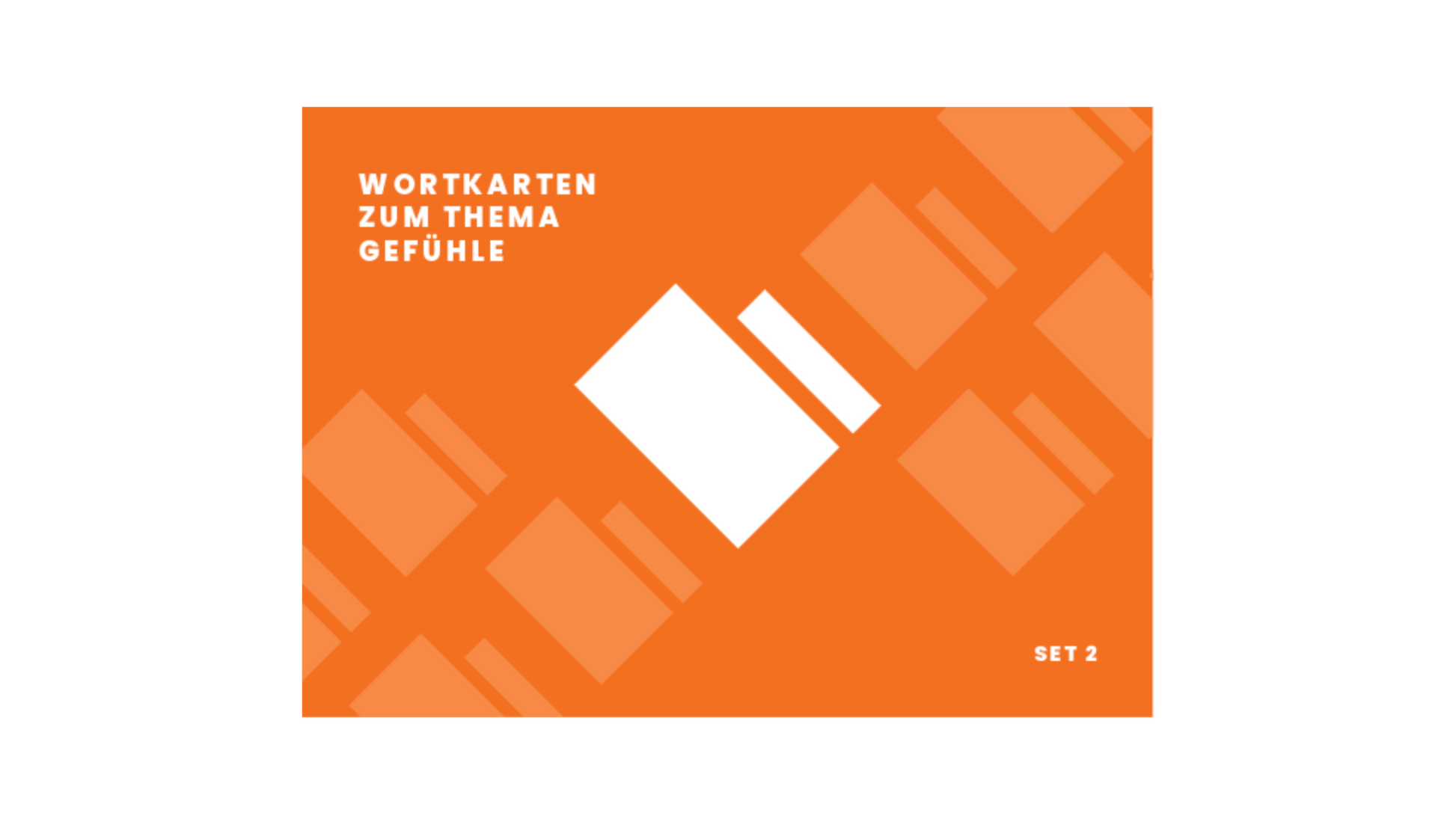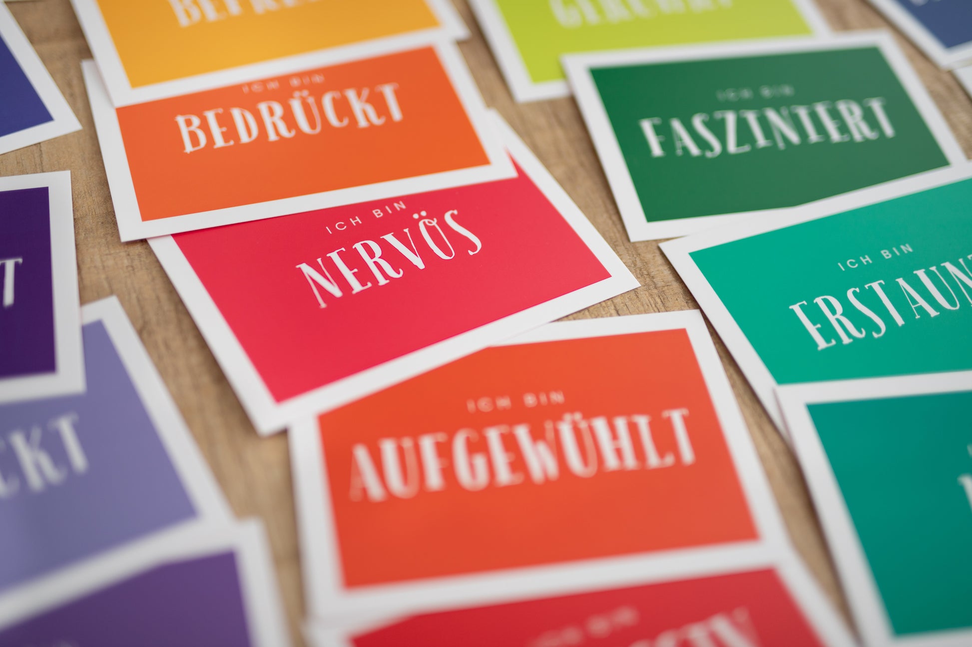 Das Set 2 enthält folgende Wortkarten: Ich bin - aggressiv, aufgewühlt, bedrückt, beflügelt, befreit, deprimiert, erstaunt, fasziniert, fröhlich, gerührt, geschockt, inspiriert, misstrauisch, müde, nervös, optimistisch, rastlos, verängstigt, verliebt und verrückt.